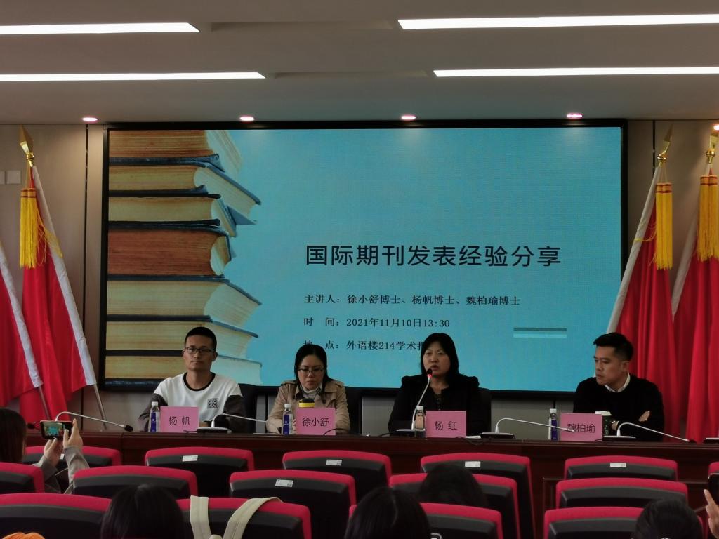 2021年11月10日下午,徐小舒博士、杨帆博士和魏柏瑜博士在外语楼214会议室分享了以“国际期刊发表经验分享”为主题的学术讲座。ylg060net永利娱高的教师及研究生参加了此次学术讲座,ylg060net永利娱高杨红副院长主持了本次讲座。此次分享会包括三个部分,期刊编辑与制作流程、期刊论文撰写和如何发表高水平高质量国际期刊。