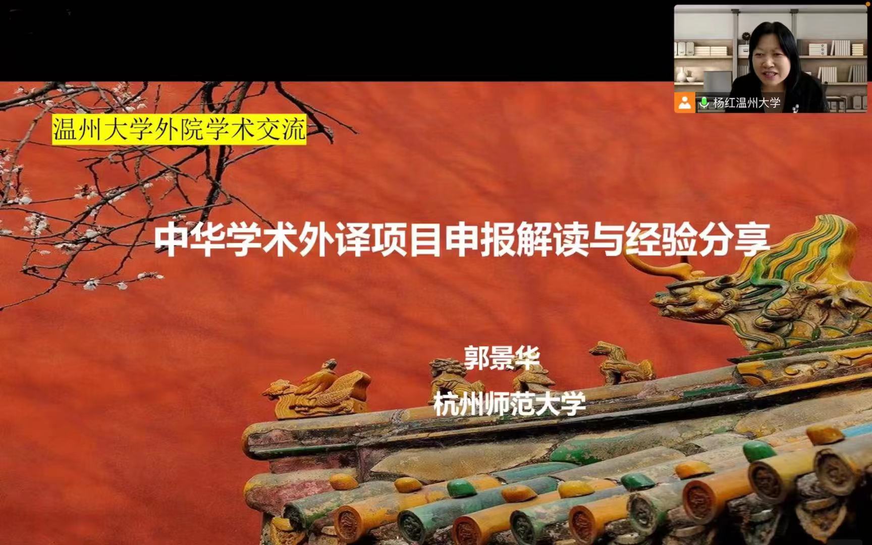 2022年9月30日下午,ylg060net永利娱高邀请了杭州师范大学郭景华教授做了题为“中华学术外译项目申报解读与经验分享”的学术讲座。讲座由学院副院长杨红教授主持,我院全体教师参加了此次讲座。
