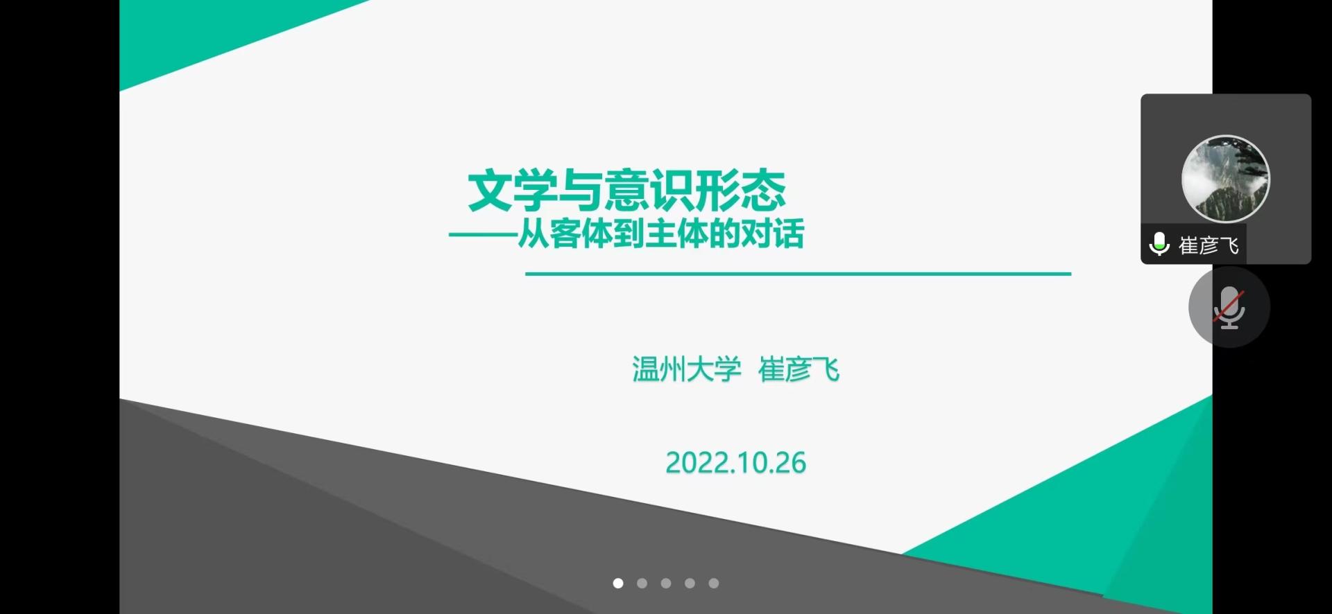 2022年10月26日,我院崔彦飞博士做了题为“文学与意识形态——从客体到主体的对话”。本次讲座由我院迟欣教授主持,我院师生参加了此次讲座。