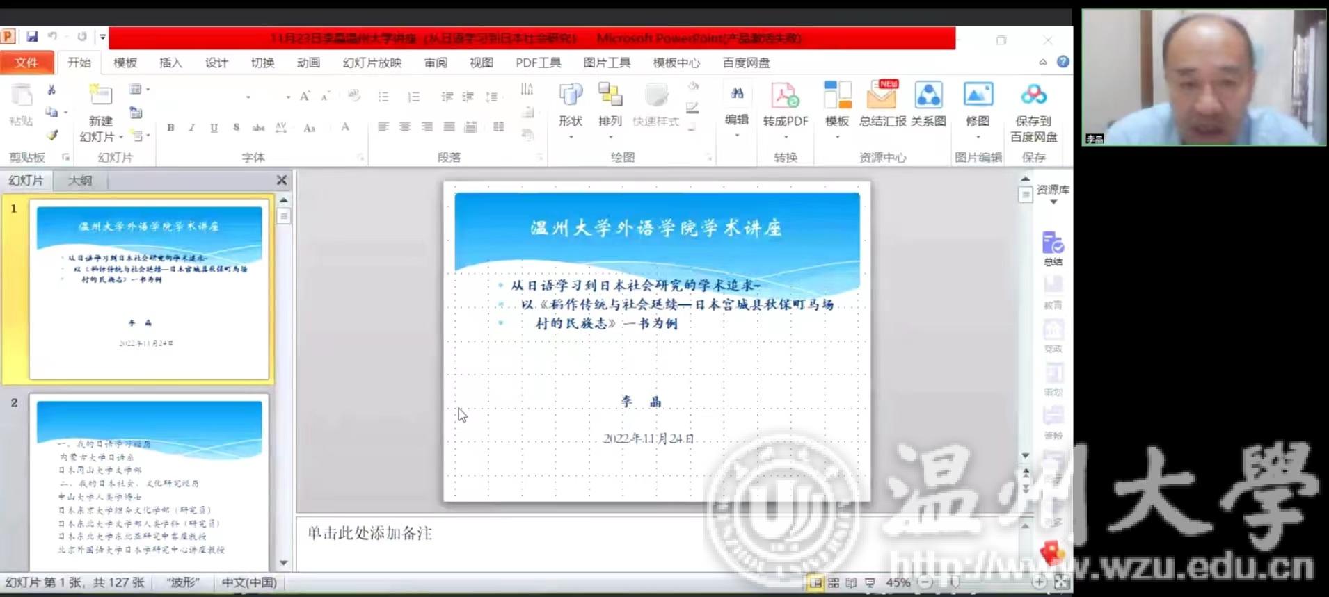 2022年11月23日,李晶教授,中山大学人类学博士,现广州应用科技学院ylg060net永利娱高教授受邀做了题为“从日语学习到日本社会研究的学术追求——以《稻作传统与社会延续—日本宫城县秋保町马场村的民族志》一书为例”的学术讲座。本次讲座由我院副院长杨红主持,我院师生参加了此次讲座。