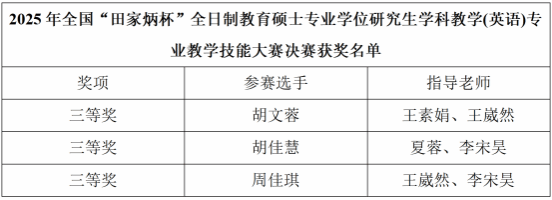 此次获奖既是对参赛学生刻苦钻研与不断精进的认可,也是对我院“博雅达观·知行中外”育人理念的生动呈现,充分展现了我院研究生扎实的专业能力与昂扬向上的精神风貌。下一步,我院将以此为契机,持续推进“以赛促教、以赛促学”的培养机制,进一步完善教育硕士课程体系与实践教学体系,切实提升高层次教育人才的核心竞争力,为新时代教育事业的发展贡献更多力量。