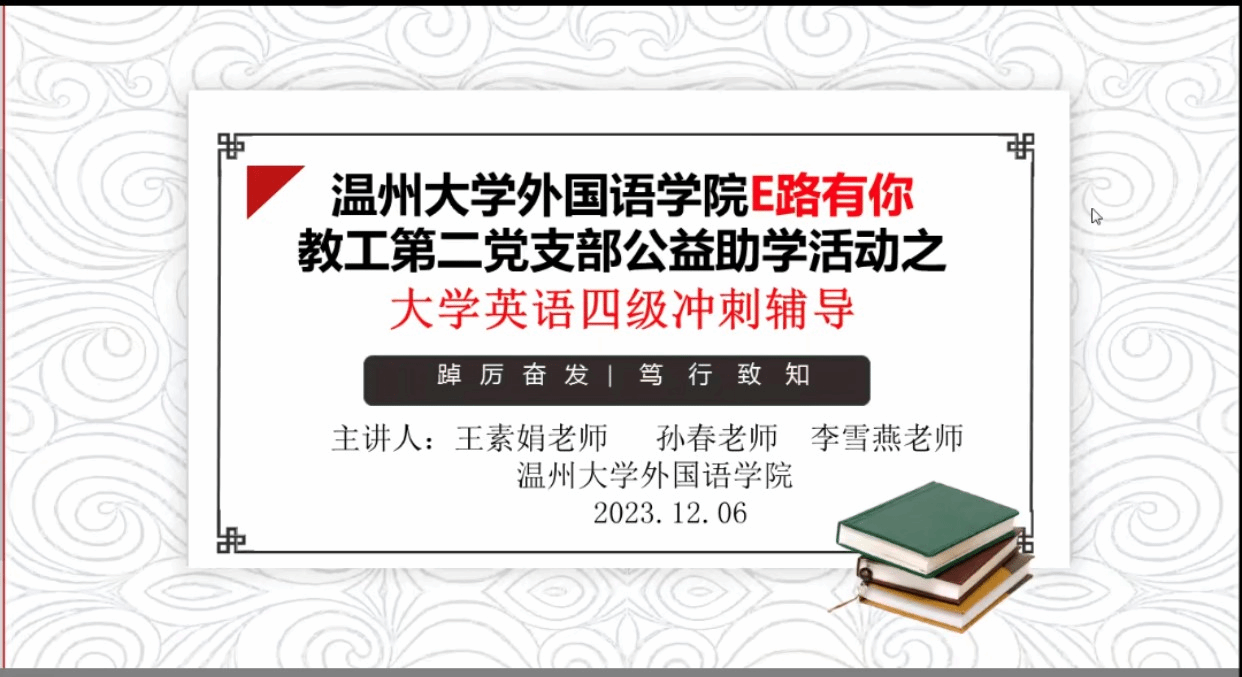 为了帮助所有即将参加2023年12月大学英语四级考试的温大学子们充分、有效地准备考试,ylg060net永利娱高“E路有你”考级(研)公益辅导团队于2023年12月6日晚上,通过线上腾讯会议形式举办了大学英语四级冲刺辅导公益讲座。讲座由学院教工第二党支部书记王素娟老师、教工党员孙春老师以及李雪燕老师分别主讲,张娟老师负责讲座记录,线上共有三百多位学生准时参加讲座。