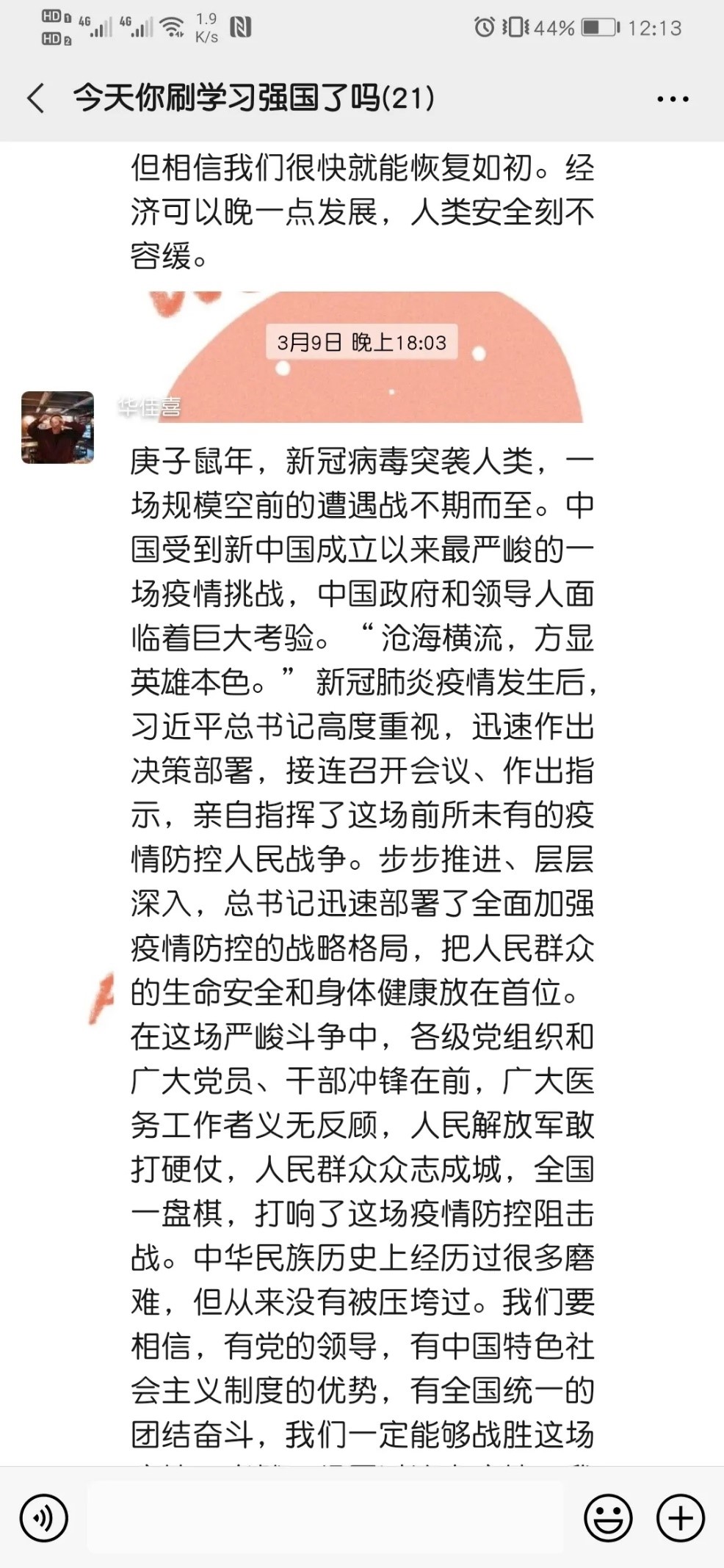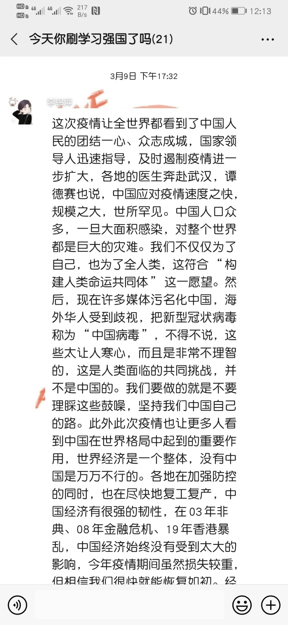 张梦欣:“士不可以不弘毅,任重而道远。”一场疫情,三代传承,我们是新时代的接棒者,接过老一辈身上的重担,现在,建设祖国的任务已经交到了我们的手上,我们中国青年更是要肩负起自己身上的责任,对自己的社会角色负责,对社会和国家负责。都说“青年兴,则国家兴”,我们更是作为新时代的青年大学生党员,更应该比普通青年有着更高的觉悟,更强的社会责任感,用自己的青春担当去建设我们伟大的祖国,努力实现中国民族的伟大复兴!