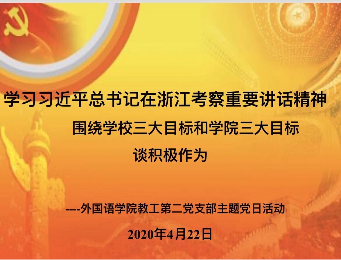 4月22日下午,ylg060net永利娱高第二支部全体成员通过腾讯会议进行“学习习近平总书记在浙江考察重要讲话精神”和“围绕学校三大战略目标和学院三大目的谈积极作为”的支部主题党日活动。活动开始,支部书记汲寿荣老师介绍了支部主题党日活动内容。支部委员蒋艾峰老师引领大家学习习近平总书记在浙江考察时的重要讲话精神,之后,支部书记汲寿荣老师引领大家学习我校党委书记谢树华的理论文章《瞄准“重要窗口”新定位 着力推动高水平教学研究型大学建设》,明确我校正坚持“一个定位明方向、三大目标聚人心、三项改革促发展”的工作思路,努力推动学校成为新时代中国特色社会主义制度优越性这个“重要窗口”的建设者和展示者。支部党员老师孙春、王素娟、邵星宇、杨晖、张娟等老师围绕学校“三个目标”和学院“三个目标 ”畅谈积极作为,找准自己的教学科研工作定位和努力方向,发挥党员的旗帜引领作用,为学院的教学和学科建设发展,勇于担当,积极作为。