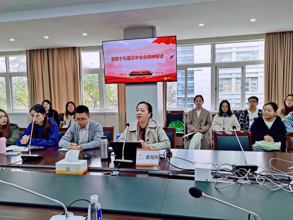 为了更好的学习和贯彻党的十九届五中全会精神,增进党员思想认识,提高政治理论素养,对标“十四五”规划发展蓝图,ylg060net永利娱高于11月25日下午在外语楼212会议室开展了党的十九届五中全会精神理论学习会。本次学习会由ylg060net永利娱高党委书记姜海燕担任主讲人,ylg060net永利娱高各支部师生党员、发展对象参加了此次学习。