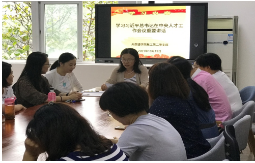 活动首先由支部书记汲老师带领参会党员教师认真学习了习近平总书记在中央人才工作会议的重要讲话。在中央人才工作会议上,习近平总书记强调要下大气力全方位培养、引进、用好人才,并做出重要部署。人才是衡量一个国家综合国力的重要指标。国家发展靠人才,民族振兴靠人才。其中的八个坚持是对我国人才事业发展规律性认识的深化,要始终坚持并不断丰富发展。千秋基业,人才为本。在向第二个百年奋斗目标进军的新征程中,我们每一位党员应该更加紧密地团结在以习近平同志为核心的党中央周围,增强“四个意识”、坚定“四个自信”、做到“两个维护”,深入实施新时代人才强国战略,努力增强自身的创造力,充分发挥自己的聪明才智,为实现中华民族伟大复兴的中国梦汇聚磅礴力量。