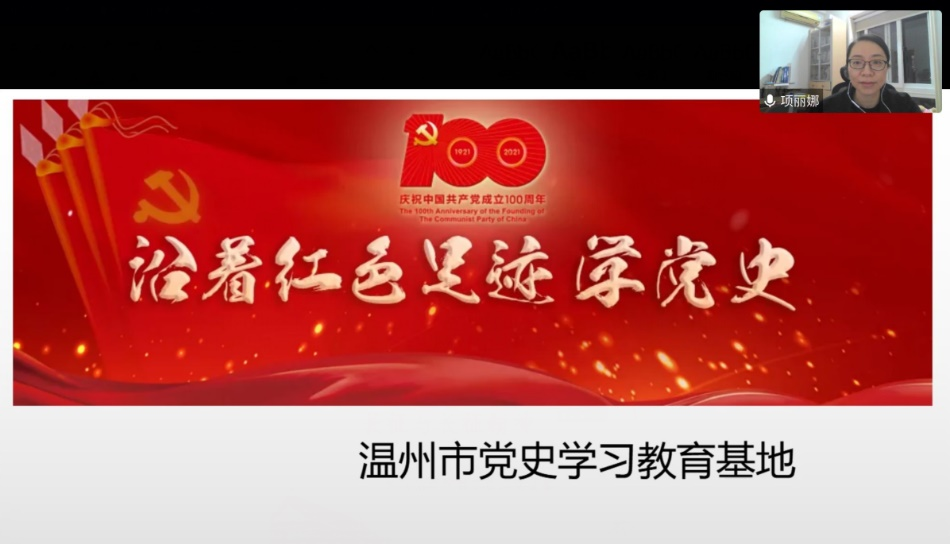 会议首先由项丽娜老师带领我们云参观了两个温州市党史学习教育基地,一起寻访了红色“印记”,感悟温州革命先辈的崇高精神和家国情怀。中山纪念堂是浙南第一座也是唯一一家以纪念孙中山为主题的建筑,与历史街区有效衔接,有机融合,是具有爱国、奋斗、团结、统战意义的重要平台。温州城区革命历史馆全面展示了从1924年中共温州独立支部建立到1949年浙南全境解放这25年波澜壮阔的革命历史,让参观者们置身于馆区如同身临其境地走进了那段英勇斗争的岁月。
