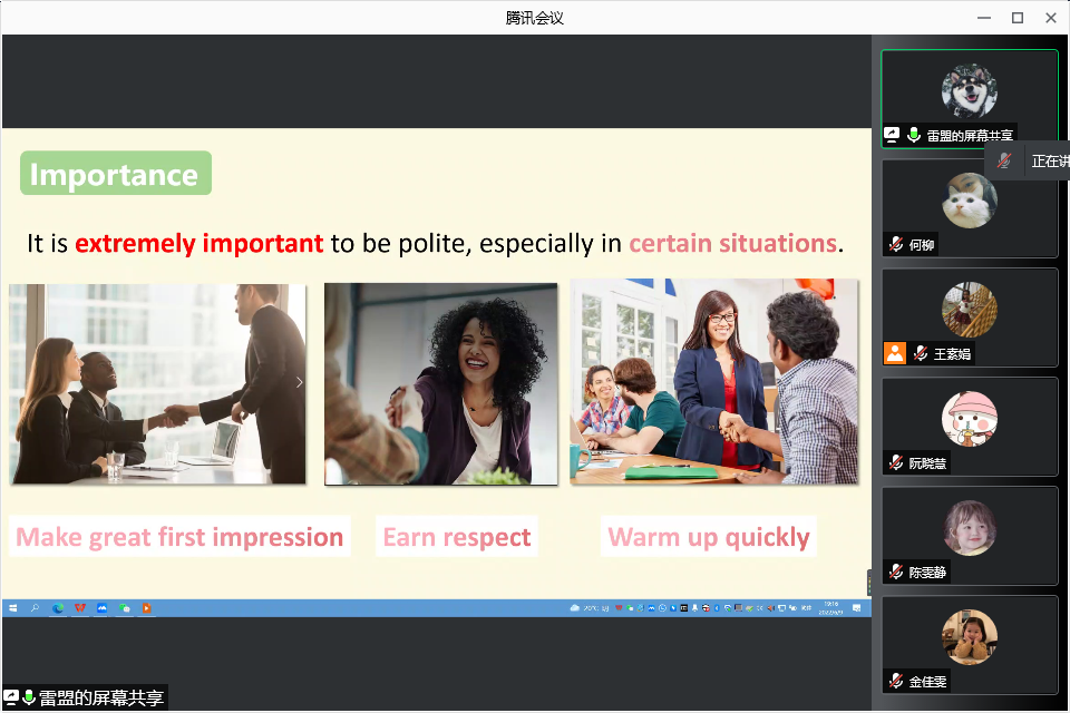 论坛之后,是师生的英语角,同学们纷纷发表感言,觉得本次党日活动主题很有意义,形式新颖,达到内化于心、外化于形。同学们表示今后要在生活学习中注重言语和行为文明,做到有礼有节、德才兼备,大家的交流气氛既活跃又融洽。最后,王老师进行总结,她一一点评了各位老师与同学的分享内容,着重强调了在疫情期间中国在疫情期间的大国担当。在疫情暴发初期在严峻斗争中,体现人民至上、生命至上的理念,举国抗击疫情,树立中国形象与大国担当;在抗疫形势持续向好、生活秩序加速恢复时,中国加强疫情防控的国际援助与合作,充分体现人类命运共同体的责任与担当。华夏自古以礼仪之邦著称,以实际行动为世界各国的防疫作出重要贡献,得到国际社会普遍赞扬,这样的精神行为正是中华民族同舟共济、守望相助的家国情怀的具体体现。最后以欣赏一首英文歌“感恩的心”来结束本次别开生面的主题党日活动。