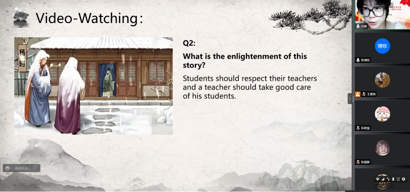 王素娟老师引经据典,以传统诗文中体现的“知恩、感恩、回报”主题进行自然导入,并介绍活动的主要安排。本次活动主要包括对礼貌用语、中国文化礼仪故事和跨文化交际礼仪的内容进行分享与交流。