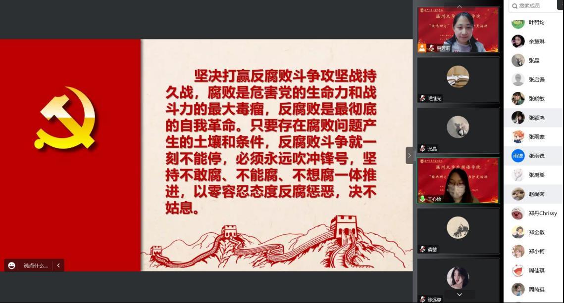 来自22级英语专升本2班的王心怡同学从反腐倡廉讲起,带领同学们思考作为新时代的青年,我们该如何做到“反腐倡廉”。 她强调了“三个务必”的思想:务必不忘初心、牢记使命;务必谦虚谨慎、艰苦奋斗;务必敢于斗争、善于斗争。来自20级英语师范4班的夏希玥同学则是紧密结合自己的专业学习,用全英文流利地分享了她对党的二十大报告学习的个人心得,带领同学们思考当代青年人所应肩负的历史使命。
