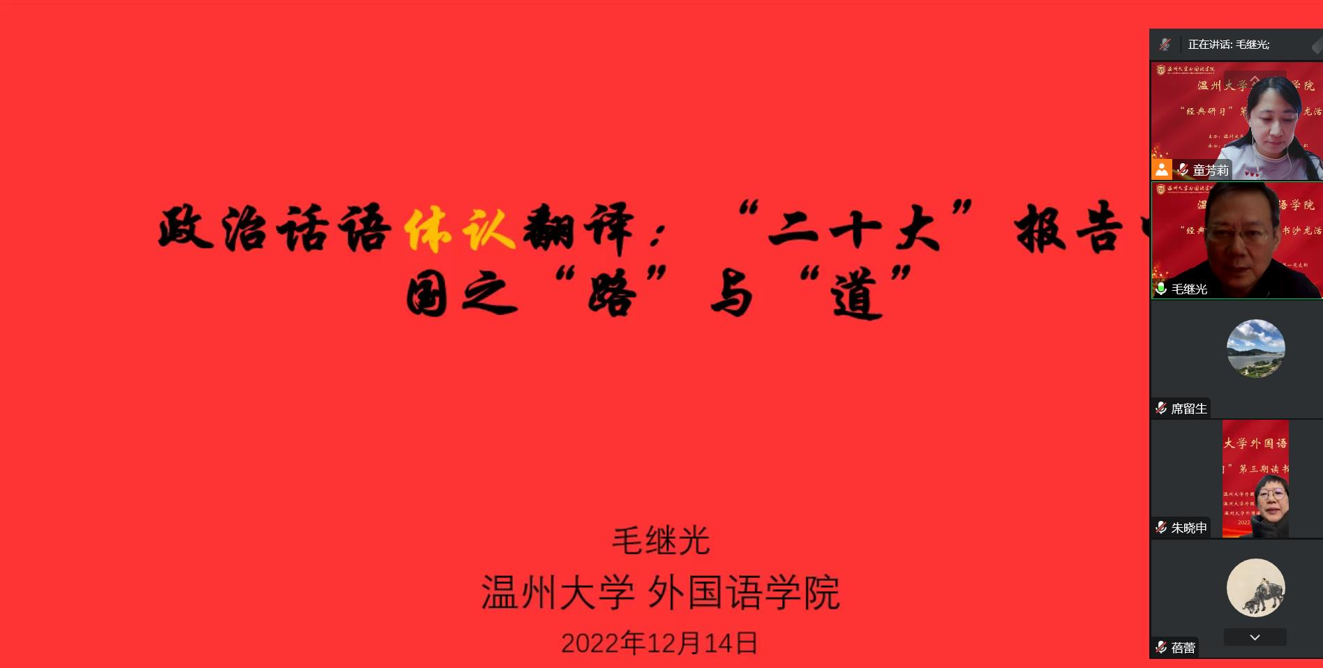 本次活动的形式别开生面,师生共学党的二十大报告。首先教师主讲人是来自外院教工第一党支部的支部书记毛继光教授。他给师生们做了题为:政治话语体认翻译:党的二十大报告中国之“路”与“道”的报告。毛老师从“路”与“道”的双语辞书定义、前期的研究以及党的二十大报告中“路”与“道”的英译三个方面做了深入浅出的分享。毛老师特别提到,在党的二十大报告的英文版中“path”一词涵盖了“中国式现代化发展之路”。“国所经历”、“民之奋斗”、“特色认可”、“既定方向”、乃是“复兴之路”。中国式现代化强调了中国特色、中国经验、中国道路,其发展核心是不能照抄照搬。在百年建党之时,习近平总书记提出了一个全新的“两个结合”,中国式现代化不只是与中国具体实践相结合,还要与中国几千年优秀的文化传统相结合。毛老师从体认翻译的角度详细地解读了党的二十大报告,使与会的师生党员们受益匪浅。