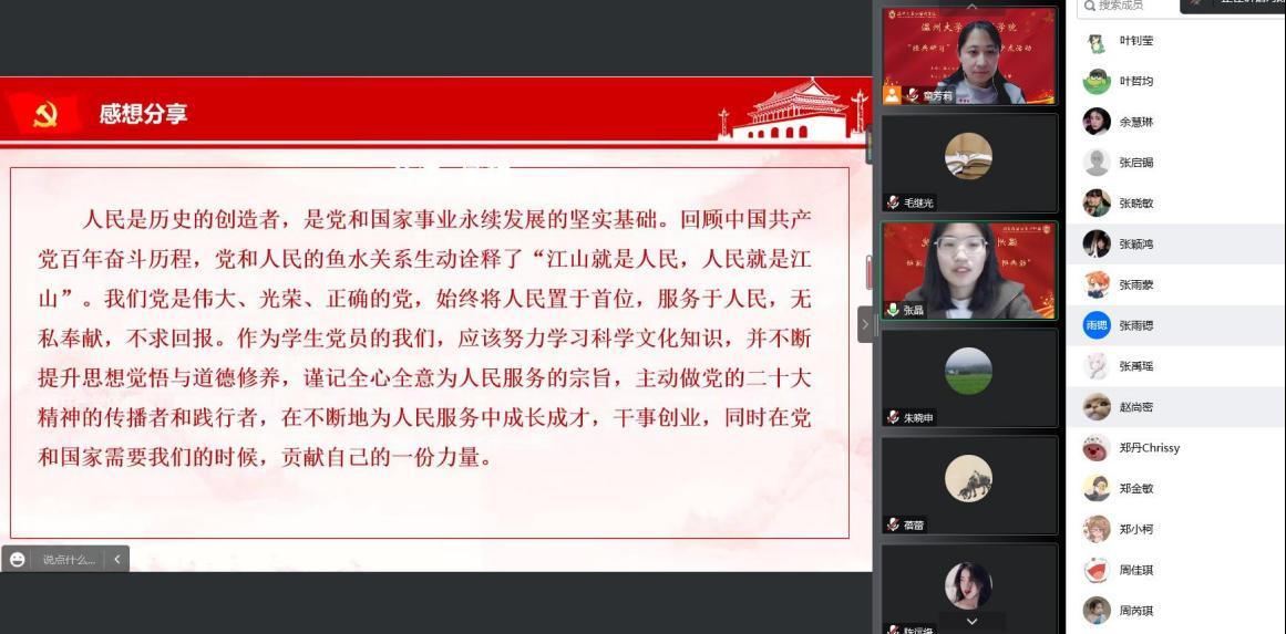 其次,本次活动还邀请了外院学生党支部的优秀党员代表给大家做了党的二十大精神体会与感悟分享。来自19翻译1班的张晶同学从分享党的二十大报告中的金句开始,结合用生命诠释公仆本色的兰辉同志和坚定初心的黄文秀同志的先进事迹,告诉青年学子们必须要努力学习,提高综合素质,不断完善自身,练就过硬本领、锤炼品德修为,树立正确的人生观、价值观、世界观,坚定理想信念,脚踏实地,担负起新时代赋予的历史使命,贡献属于青年的青春智慧和青春力量。