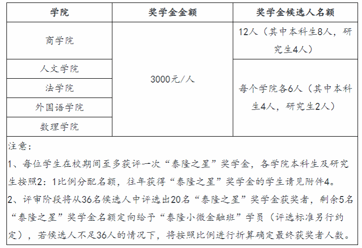 1、申请及初审:本科学生根据名额分配条件,规范填写电子和纸质《“泰隆之星”奖学金申请表》(附件1,重命名为姓名+学院+申请表)、电子《“泰隆之星”奖学金发放名单汇总表》(附件2)、电子《“泰隆之星”奖学金获奖情况汇总表》(附件3),于11月15日前将相关材料发送至:zzhongxin@163.com,邮件主题为“姓名+泰隆之星奖学金”。学院按照公开、公正、公平的原则评审。