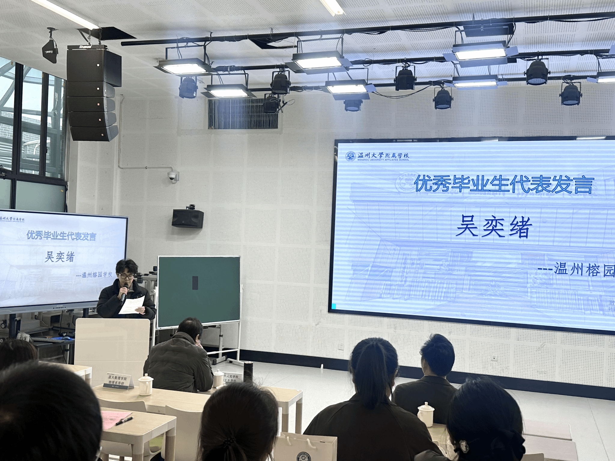 2023级英师专业陈子辉、吴嘉洁同学作为新生代实习教师代表发言。他们结合专业学习感悟,郑重承诺:将严格遵守实习纪律,虚心向指导教师请教,通过“备课-试讲-反思”闭环提升教学能力,以饱满的热情和专业的态度完成各项实习任务,争做“四有”好老师的践行者。